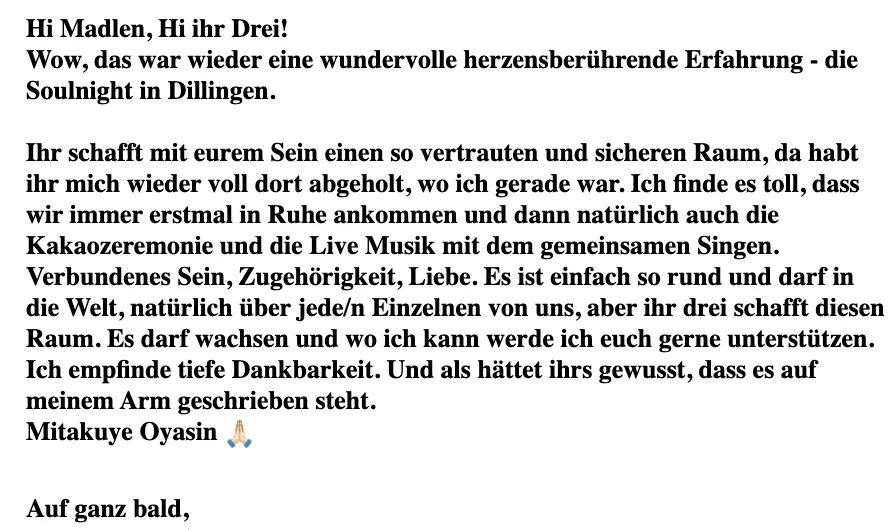 Von Anfang an arbeiten wir mit viel Liebe und Leidenschaft an der Entstehung dieses großen und besonderen Events. Am 26. Juli war es dann so weit: Die allererste Soul Summer Night wurde Realität. Über 40 wunderbare Menschen kamen zusammen, tanzten barfuß unter dem Sternenhimmel, ließen sich von der Musik tragen und öffneten ihre Herzen in der nährenden Kraft des Kakaos. Für uns war es überwältigend, die Energie, die Verbundenheit, die pure Freude. Die Reaktionen waren so herzlich und berührend, dass schnell klar war: Das war erst der Anfang. Aufgrund der hohen Nachfrage fand 3 Wochen später schon die zweite Soul Summer Night statt - mit noch größerem Erfolg!